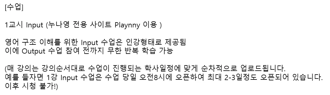 누나영 수업은 구문 이해 수업과 연습 수업으로 진행되는 골격으로 온라인상 학습시 구문이해 수업은 여러번 반복 학습을 할 수 있도록 인강 형태의 수업으로 제공합니다.